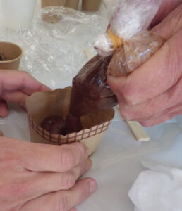 ④アイラップ(袋)の端を5mm程度切り、カップの中に絞ります。この時、カップの半分まで絞ったらチョコチップを入れ、その上からさらに絞っていきます。