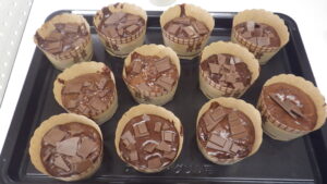 チョコマフィンが完成すると「いい匂い」「上手に焼けた!」「冷蔵庫で冷やして食べても美味しそう」「チョコたっぷりで嬉しい」という声をいただきました。